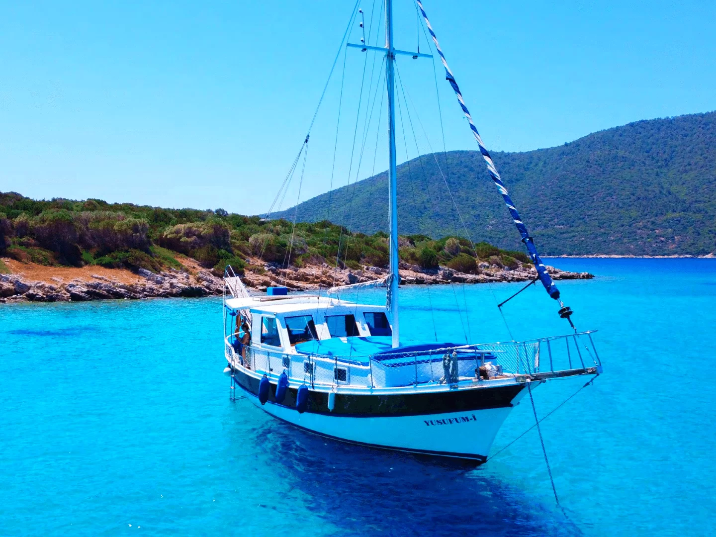 İhtiyaçlarınızı karşılayabileceğiniz tuvalet ve rahatlıkla giyinebileceğiniz giyinme odası bulunan guletimiz toplam 12 kişilktir. Dileyen misafirlerimiz istirahat etmek için odayı kullanabilirler. İstediğiniz müzikleri dinleyebileceğiniz müzik sistemimiz mevcuttur. Wi-Fi olanağında bulunan teknemiz Bodrum'un en eşsiz koylarında sizlere gün boyu hizmet vermeye devam edecektir. Dalış ekipmanlarımızdan yararlanabilir, Bodrum Denizinin muhteşem canlılarıyla birlikte yüzme olanağını deneyimleyebilirsiniz. Olta tanımı ile keyifli dakikalar yaşayabilir farklı tecrübeler edinebilirsiniz. İhtiyacınız doğrultusunda sizin için özel olarak hazırlanmış olan plaj havlularını temin edebilirsiniz. Mavi turdan yorulan misafirlerimiz ihtiyaç halinde mide rahatlatıcı hap ve ilk yardım malzemelerimizi deneyimli ekibimizden isteyebilirler.